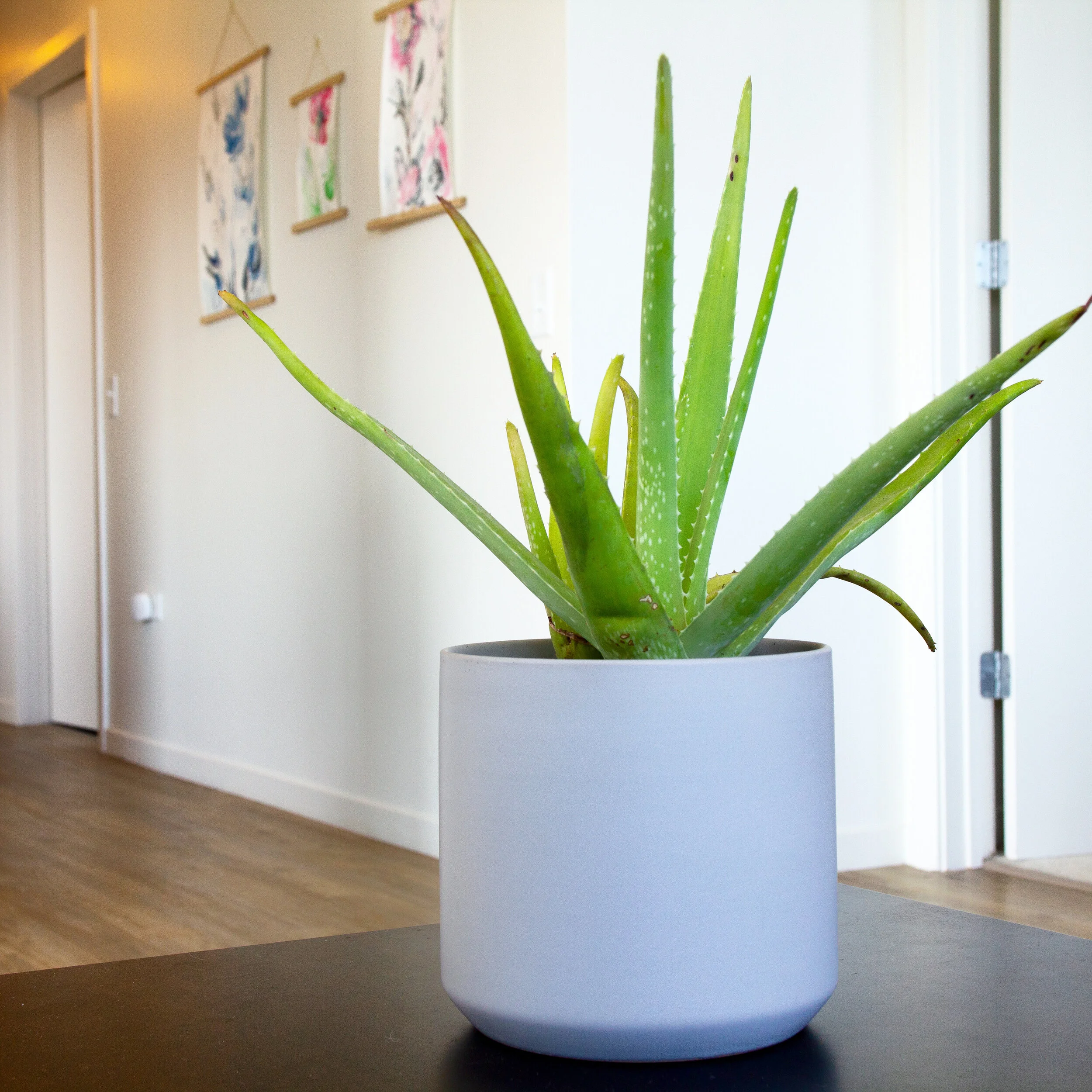 This guy is another fire survivor. He took quite a beating as he was sitting by a window that was knocked out by firefighters. I found him beneath a pile of debris, but only one of his stalks was broken off. His tips are a bit brown from the abuse (smoke, fire, and freezing temps) and there is still evidence of the trauma (the indentations on his stalks) but we are seeing a lot of new growth. One of the guys on the restoration crew told me aloe plants are good luck…I wasn’t sure how to take that since he was in the process of boarding up my window after the fire. Maybe he meant I needed more of them? His new pot is from Hearthstone and Terrace.