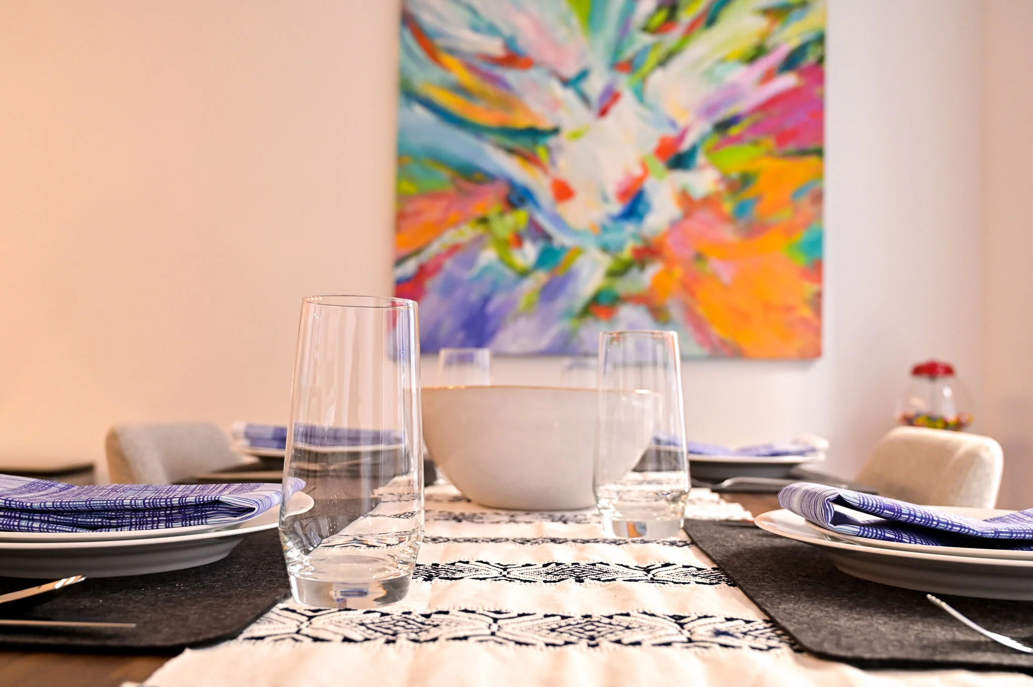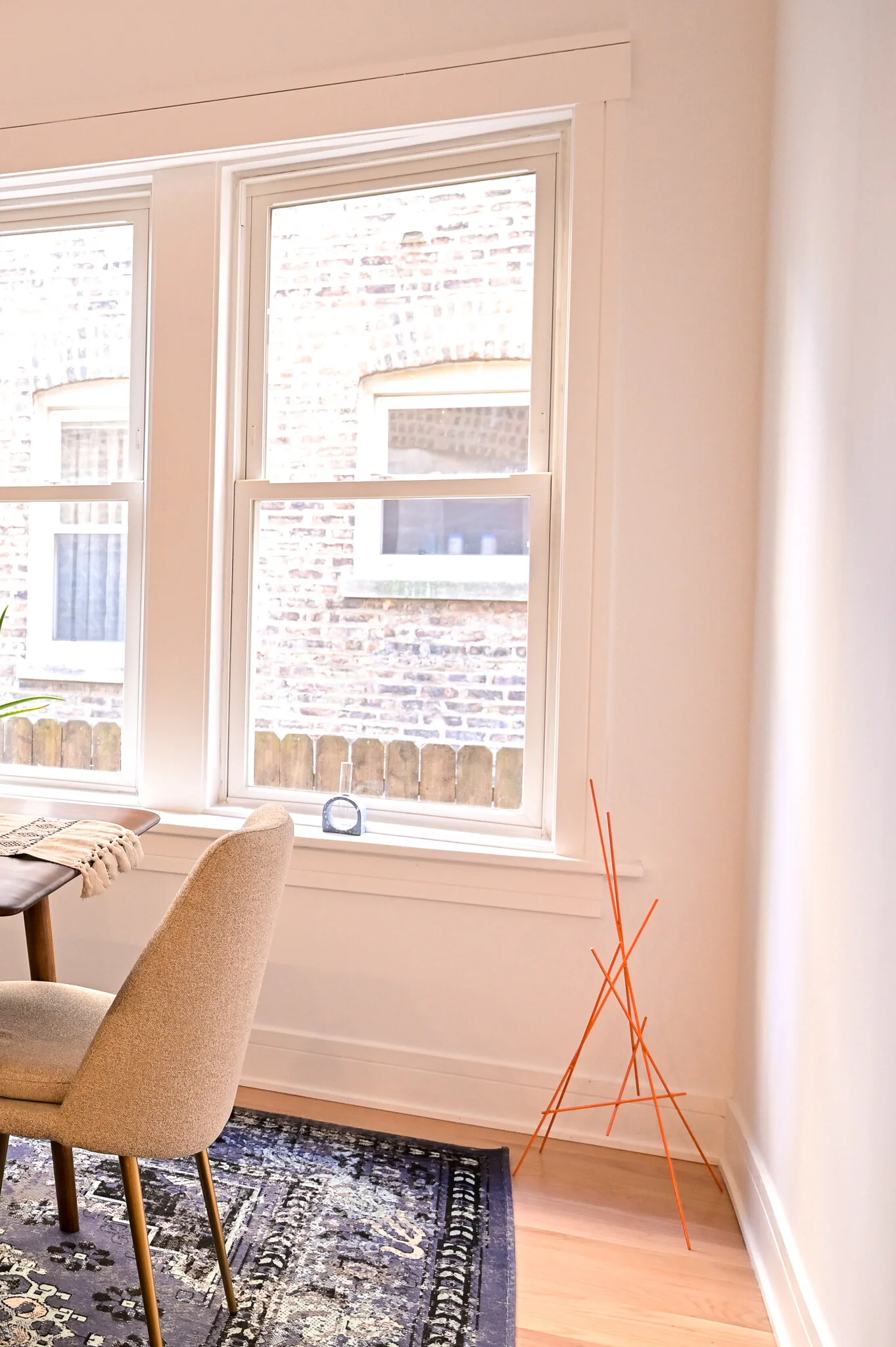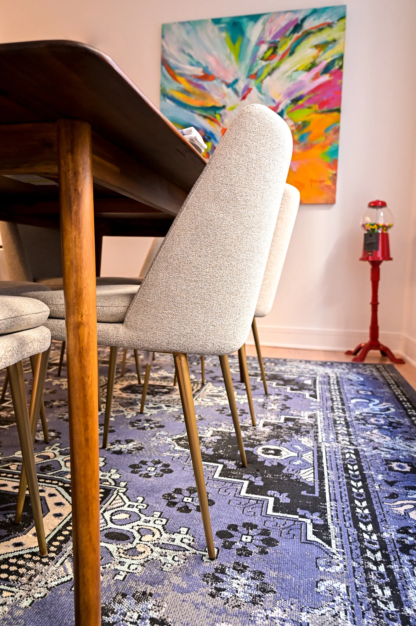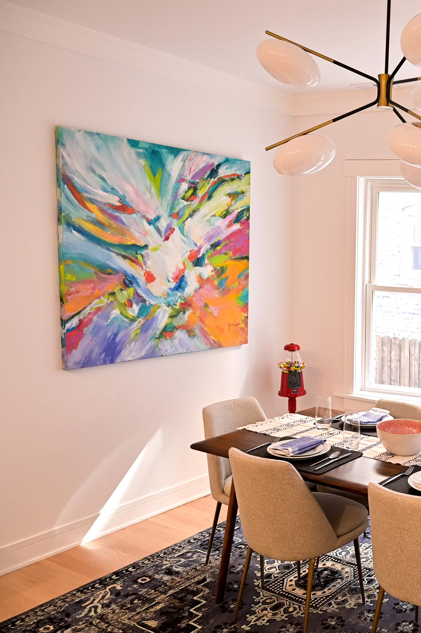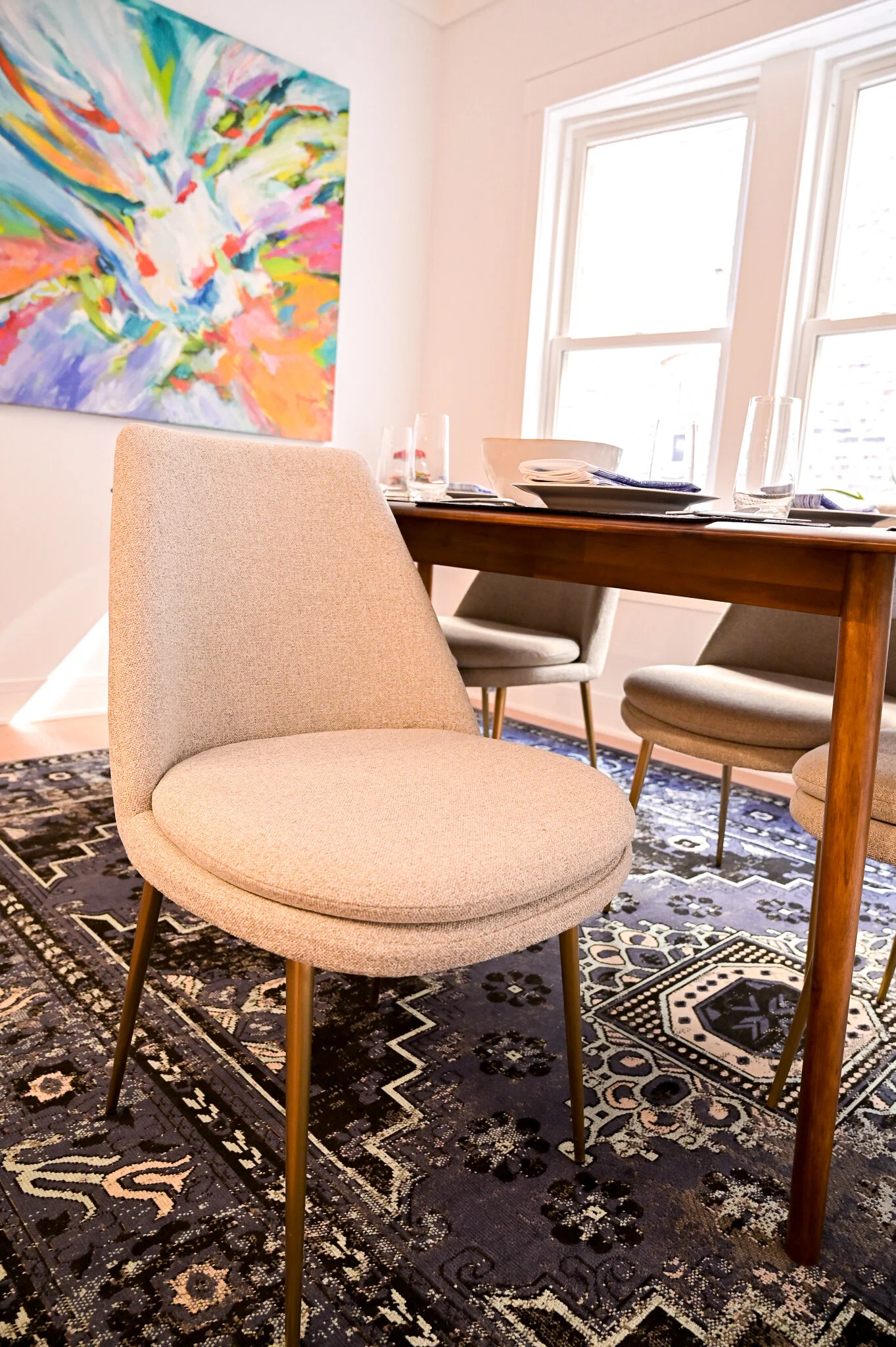 I was so nervous about the dining room rug clashing with the Jane Matranga painting. I had a dozen PowerPoint slides with the painting side-by-side with different rug options. I quickly settled on a rug that was predominately blue and finally found this one that was a great compliment to the painting but was still interesting. I worked with Hearthstone and Terrace, a local boutique in Chicago, to order this piece.