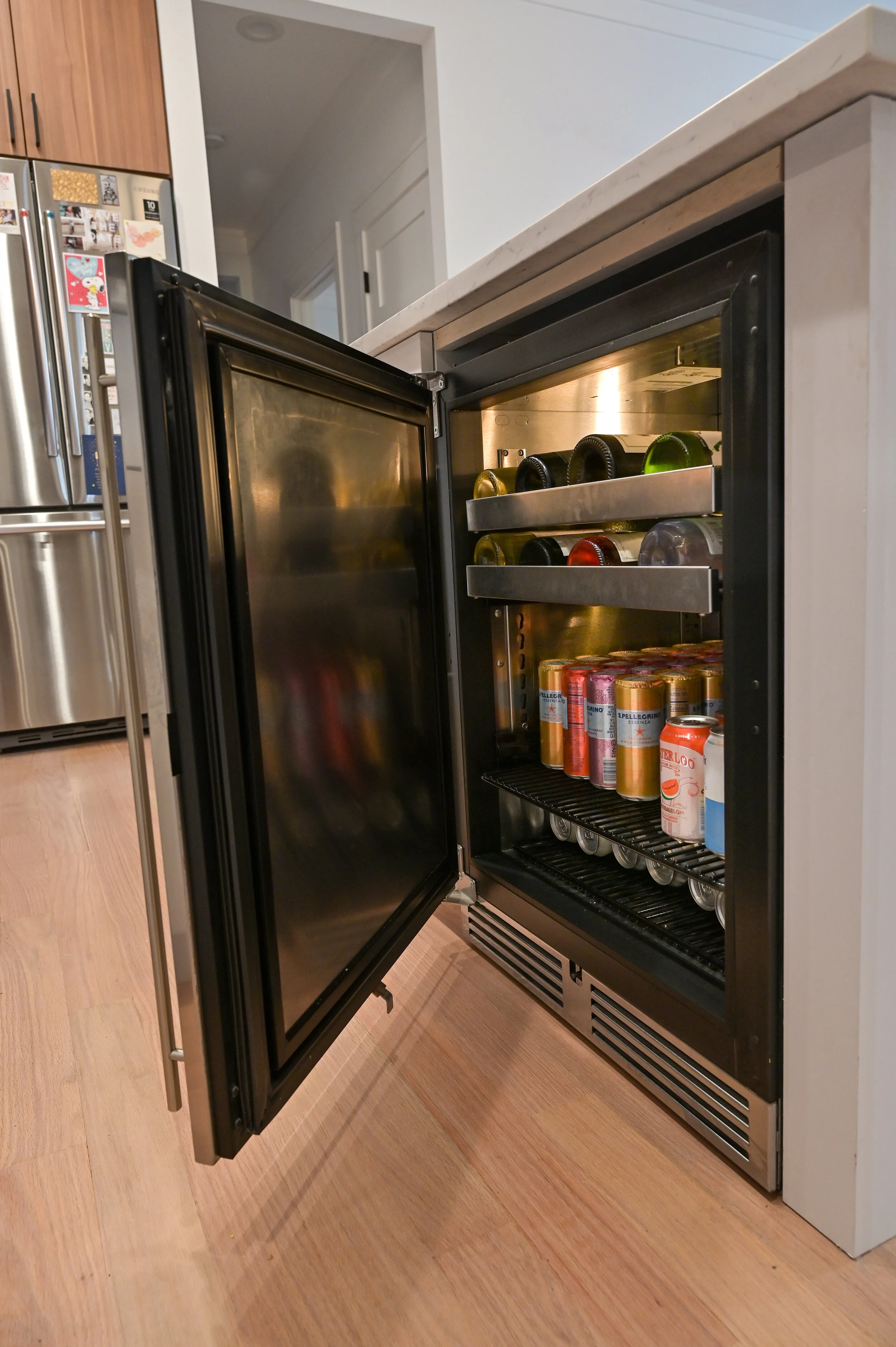 This was a new addition to the kitchen. Because our refrigerator is so small, we felt adding a beverage center would open up a lot of space for other food items. This beverage center holds 16 bottles of wine and 54 cans.