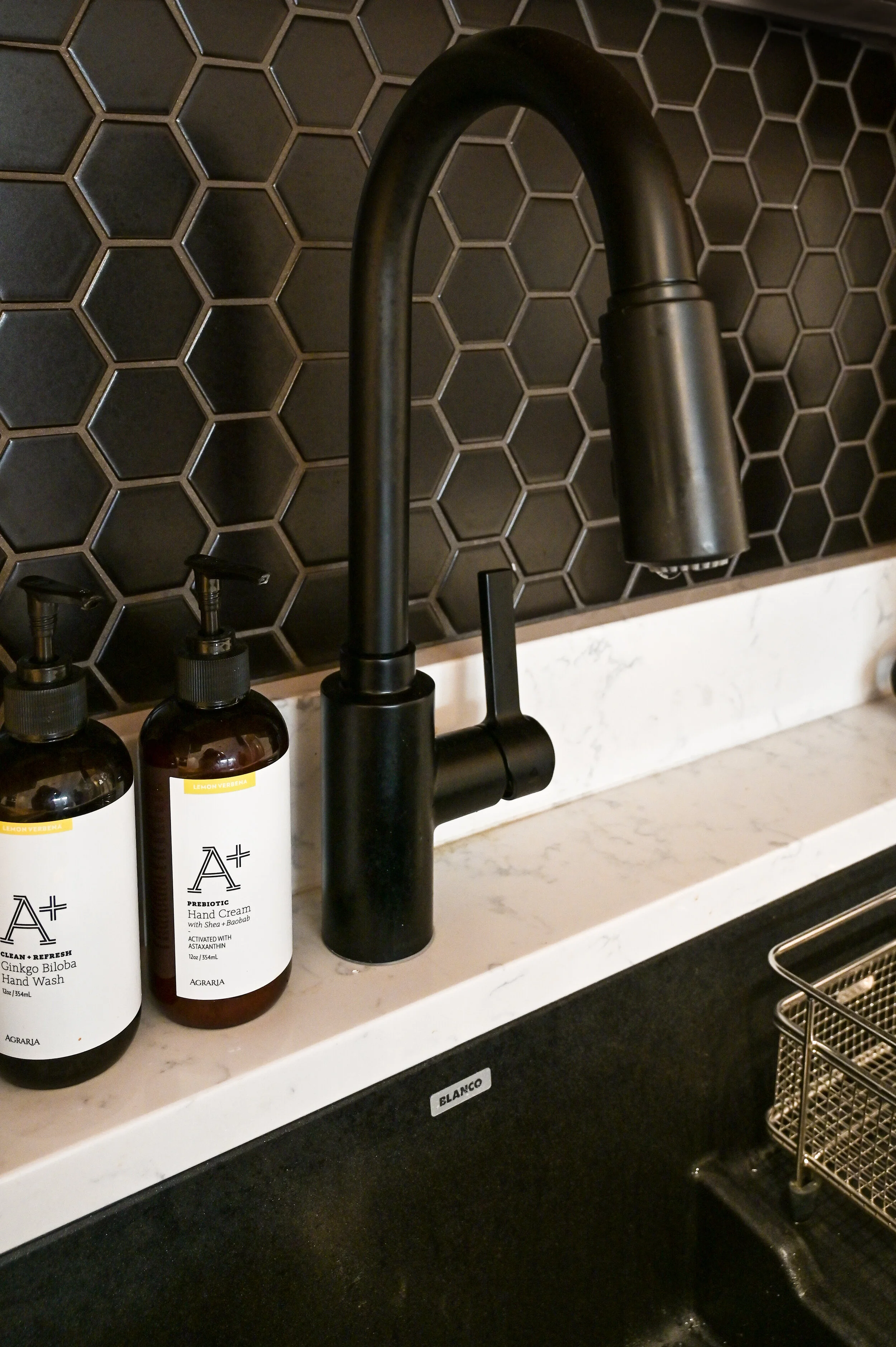This sink is made of Silgranit, which is 80% natural granite mixed with a high quality acrylic...which doesn’t mean a whole lot to me. What does mean a lot to me is that it is a heat, scratch, and stain resistant material and easy to clean...now you’re speaking my language. We opted for Anthracite (a matte black) to go with our cabinet pulls and light fixtures, but it comes in a variety of colors including white, several shades of grey, brown, and tan.