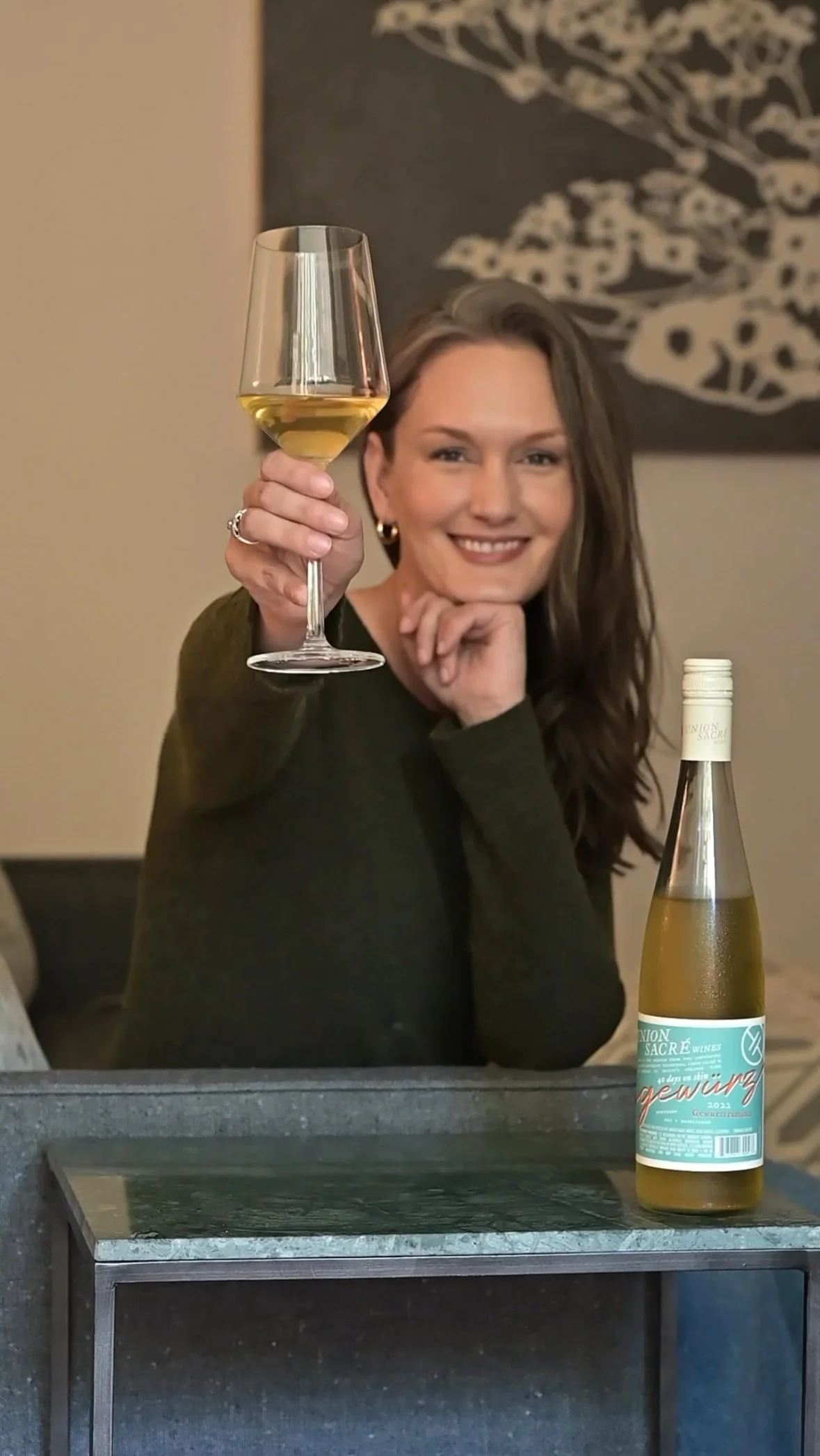 Wearing a beautiful, cozy green sweater that wraps her in warmth, she feels an instant connection to the season’s comfort. Paired with wide-legged jeans, her look is both relaxed and stylish, with just the right balance of casual and chic. The gold hoop earrings add a touch of understated elegance, catching the light as she moves. As she sips on a crisp glass of white wine, the cool, refreshing taste perfectly complements the serene vibe of the moment. In this simple yet perfect scene, she feels like the main character in her own life, embracing the beauty of the everyday with grace and confidence.