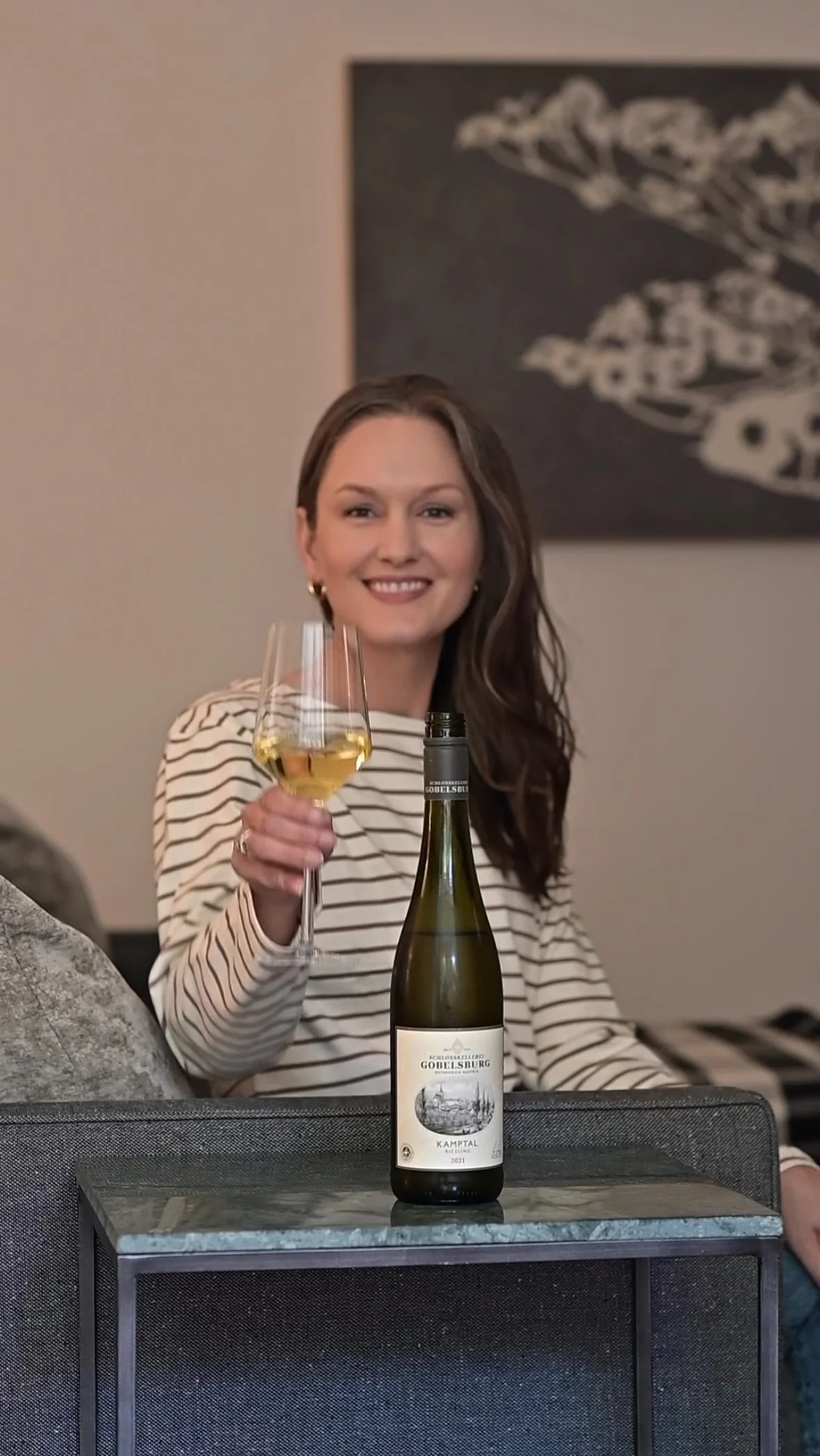 Wearing an ivory and tan striped boat neck shirt, she feels effortlessly stylish, the classic stripes giving her look a hint of Parisian charm. Paired with wide-legged jeans, the outfit flows with a relaxed sophistication, perfectly suited for a quiet moment of unwinding. Gold hoop earrings add a touch of polish, glinting softly as she moves. With a glass of crisp white wine in hand, its flavors grounding her in the moment, she feels like the main character in her own life—embracing a sense of elegance and calm that’s entirely her own, savoring the balance of simplicity and luxury.